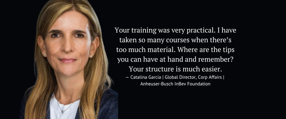 Our workshop helps high potentials structure their written and verbal content for greater impact with both internal and external stakeholders.With our feedback and coaching, we make sure that workshop attendees walk away with the communication skills they need to create clear, persuasive messaging in their day-to-day roles and interactions for emails, social posts, blogposts, presentations, sales pitches, investor pitches, as well as interactions with the media.Participants walk away with the following:(1) A clear understanding of why story is key to creating clear, persuasive verbal and written content.(2) A proven, easy-to-remember, easy- to-apply storytelling framework that's immediately applicable in their day-to-day work.(3) Communications techniques and skills that will elevate their executive presence, internally and externally.