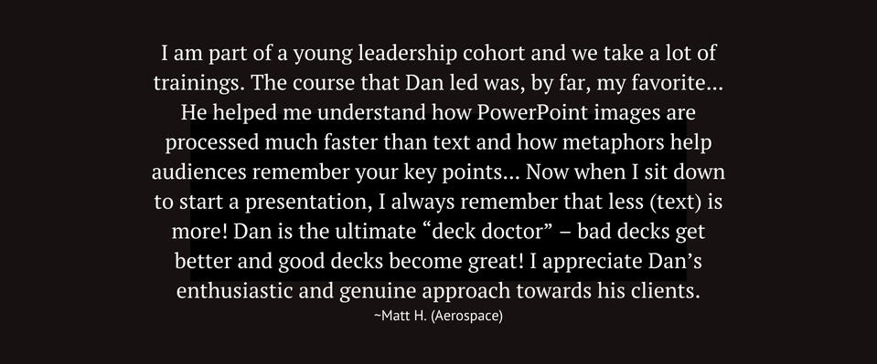 Our training incorporates a highly-interactive Tell, Show, Do, and Review approach to ensure the best learning experience.The Tell Section educates participants by sharing an insight, a point of view, or a definition.The Show Section demonstrates what we share in the Tell Section through powerful, real-world examples, including memorable video clips, riveting speech excerpts, and unique case studies.The Do Section gives participants the opportunity to put what they've learned into practice right away. This section has numerous, hands-on exercises aimed at bringing the learnings to life as well as fostering greater ownership by participants. Participants then share their work and receive peer and instructor feedback in real time.The Review Section recaps what has been taught using engaging visual prompts with an emphasis on driving retention through a question and answer format.